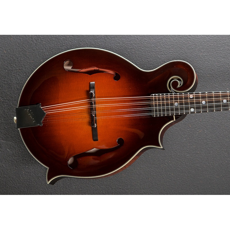 “The F-5G is a Modern Collection version of Gibsons iconic F-5 design. Tuned to the needs of modern mandolin players, its player-friendly specs include an unbound ebony fingerboard, a 14-degree fingerboard radius, no pickguard, and a short fingerboard extension. The neck and body are made from figured red maple and are coupled with a carved Sitka spruce top. The F-5G features refreshed specifications, contours, and construction for optimal acoustic response. Finished in Dark Burst gloss nitrocellulose lacquer, a hardshell case is included.”