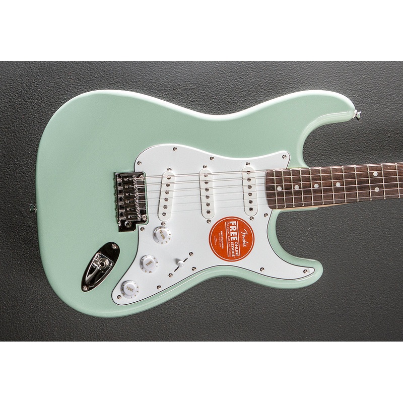 Surf Green, Crafted in China, Gloss polyurethane body finish, Poplar body, C shaped Maple neck with a 9.5 radius Indian Laurel fingerboard and medium jumbo frets, 25.5″ scale length, 1.650″ nut width, Ceramic single coil Strat pickups, 5-way switching with the master volume, tone 1. (neck/middle pickups) and tone 2. (bridge pickup) controls, Two point synchronized tremolo with the block saddles, Standard die-cast tuners, 7.0 pounds, Case not included
