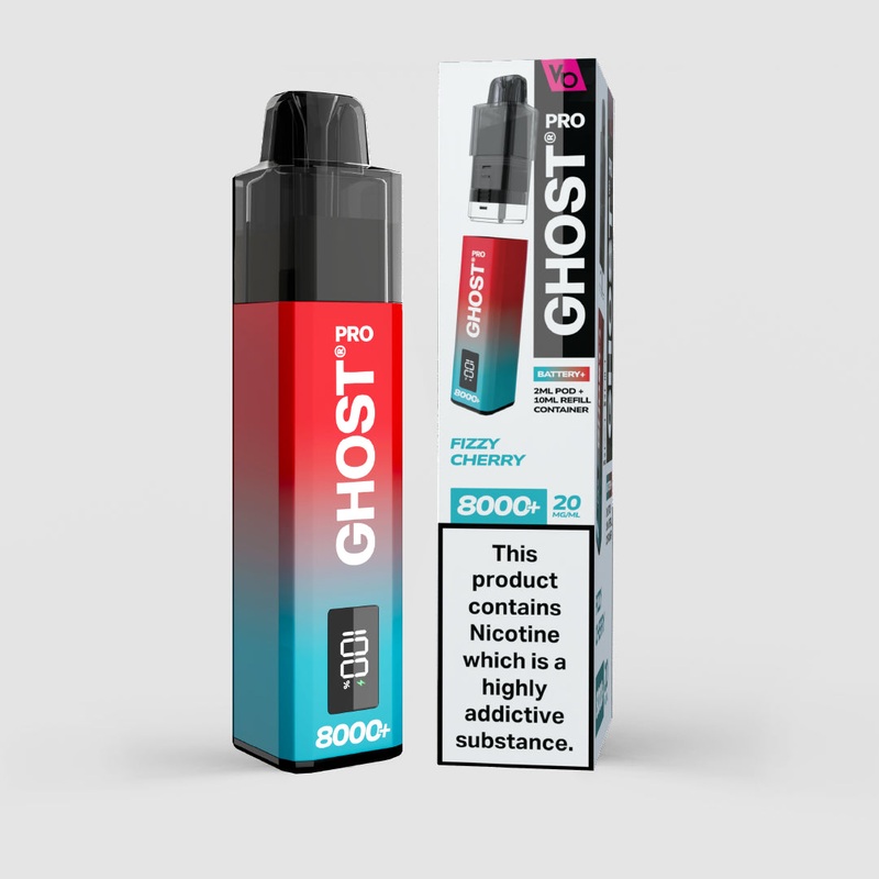 SOLD ONLY IN THE UK. Ghost Pro 8000+ Fizzy Cherry delivers bold cherry flavour with a fizzy twist. Sweet, tangy, and lightly sparkling. Upgraded version of the popular Ghost Pro 6000+, now with Removable pods extended vaping up to 8000 puffs.