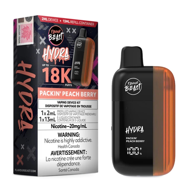 The Flavour Beast Hydra 18k – Packin’ Peach Berry – This delightful blend combines the luscious sweetness of ripe peaches with the tangy burst of mixed berries, creating a harmonious and satisfying vape.