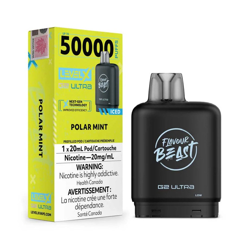 Flavour Beast Level X G2 Ultra 50k - Polar Mint Iced - An icy mint flavour from beginning to end. Flavour Beast Level X G2 Ultra 50k Key Features: Improved Puff Efficiency Dual Mesh Coil Adjustable Airflow Control Ultra-Sweet Flavours Flavour Beast Level X
