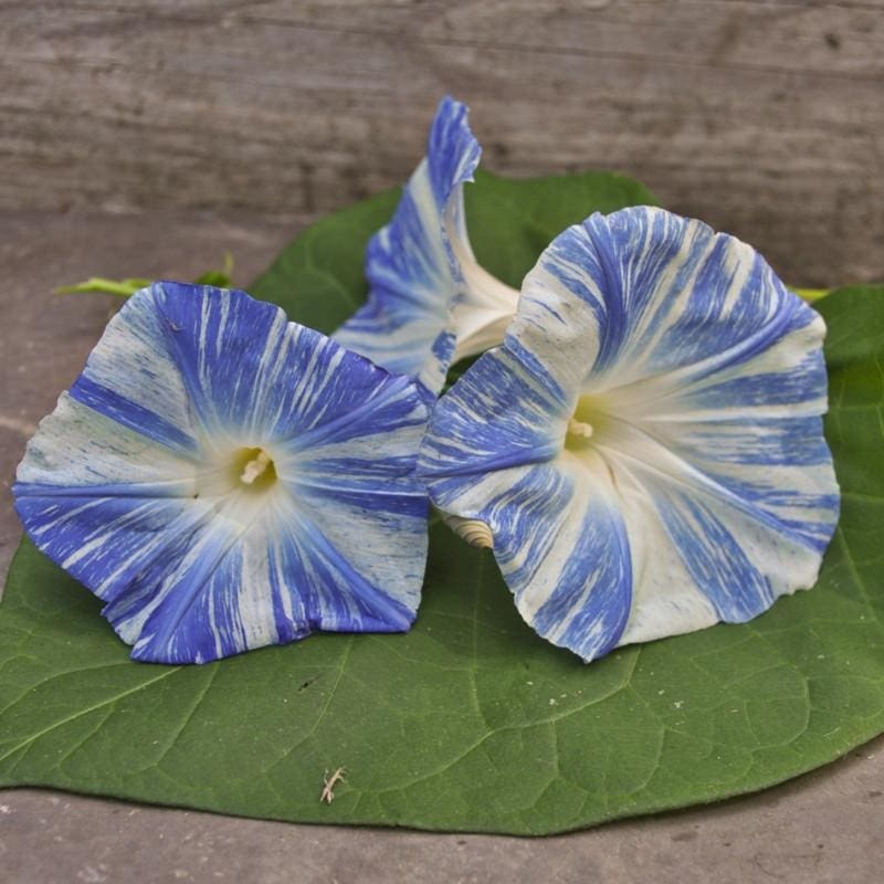 Introduced by Seedsman Darold Decker in 1960, this lofty vine is covered with spectacular 6″ flowers of white etched with varying amounts of sky blue. Very impressive from a distance.