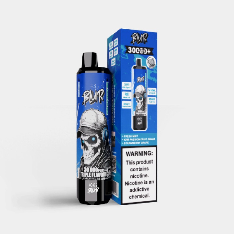 NOT FOR SALE IN UK & EUROPE Blur 30,000 Triple Flavour Disposable VapeFlavours: Fresh Mint / Kiwi Passionfruit Guava / Strawberry GrapeUp to 30,000 puffs, USB-C rechargeable, explore 33 bold triple-flavour combos. Fresh Mint: A straightforward mint flavour