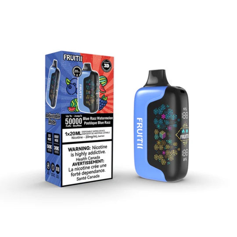 Fruitii 50k - Blue Razz Watermelon A fruity explosion combining the tangy kick of blue raspberry with the juicy sweetness of watermelon, delivering a sweet, tart, and refreshing vape experience. Fruitii 50k Key Features: 3D Curved Screen with Flashy Animat