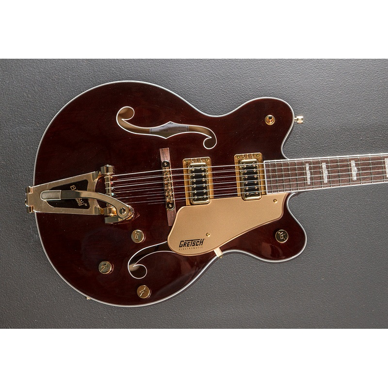 Walnut Stain, Hollow laminated Maple body with the trestle block bracing, Classic C shaped Maple neck, Bound 12″ radius Laurel fingerboard with the pearloid hump block inlays and medium jumbo frets, 24.6″ scale length, 1.6875″ nut width, Gretsch FT-5E FilterTron bridge and neck pickups, 3-way toggle switching with the master volume and tone controls plus a volume control for each pickup, Adjusto-matic bridge with the secured Laurel base, Bigsby B60 vibrato, Vintage style open gear tuners, 7.2 pounds, Case not included
