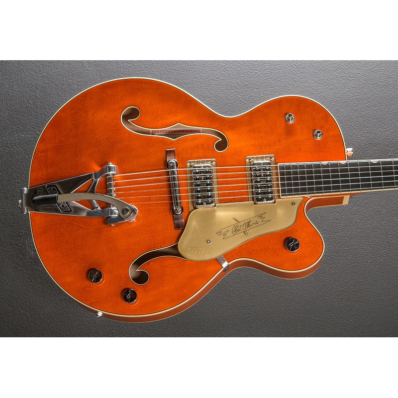 Designed for pure tone and slick, comfortable playing feel, this guitar features the classic aesthetics true Gretsch fans lovenickel G-arrow control knobs, aged white binding with black purfling, durable gloss nitrocellulose lacquer finish, aged pearloid thumbnail inlays, gold vintage thick plexi pickguard with Gretsch logo and nickel Grover Sta-Tite tuning machines. Elegant style and refined sound combine to make the G6120T-59 Vintage Select Edition ’59 Chet Atkins Hollow Body with Bigsby a Gretsch aficionados dream guitar.”