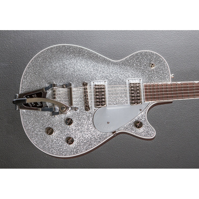 Silver Sparkle, Gloss Urethane finish,Arched laminated Maple top on a chambered Mahogany body, Standard U shaped Mahogany neck, Bound 12″ radius Rosewood fingerboard with the pearloid neo-classic thumbnail inlays and medium jumbo frets, 24.6″ scale length, 1.6875″ nut width,High Sensitive Filter’Tronbridge and neck pickups, 3-way toggle switching with the master volume and tone controls plus a volume control for each pickup,Anchored adjusto-matic bridge and aBigsb B7CP string-thruvibrato, Gotoh locking tuners,With hardshell case