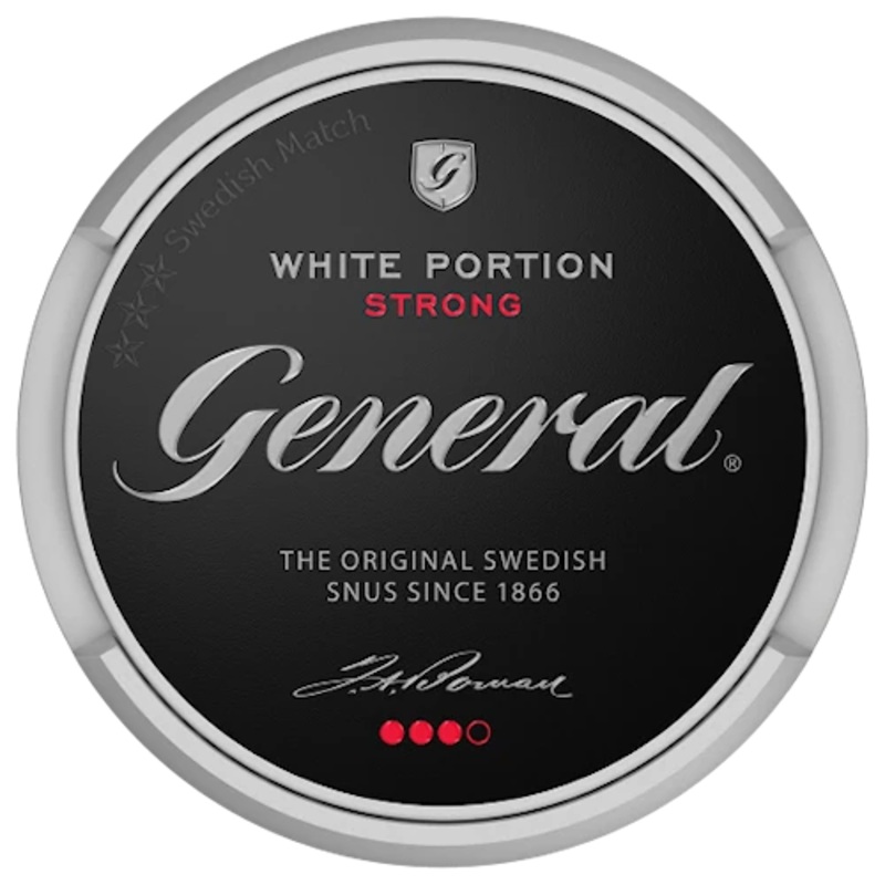 General White Portion Strong is a premium Swedish snus offering a robust and spicy tobacco flavour complemented by notes of bergamot, tea, hay, and leather. Each large white portion is designed to minimise drip, ensuring a prolonged and satisfying taste experience. With a nicotine content of 12 mg/g, this snus provides a strong and steady release, ideal for those seeking a pronounced nicotine effect. The portions are arranged in a star formation within the can, each weighing 0.9 grams, totalling 21.6 grams per can. The white portion format ensures a gradual flavour and nicotine release, offering a balanced and enduring snus experience.