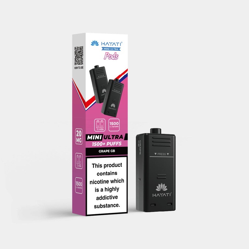 Hayati Mini Ultra Pods Grape GB Got your Hayati Mini Ultra device? Great. Now unlock 20 bold flavours and experience full-bodied clouds in every puff. Grape GB : A fruity punch of grape with a gummy bear twist.