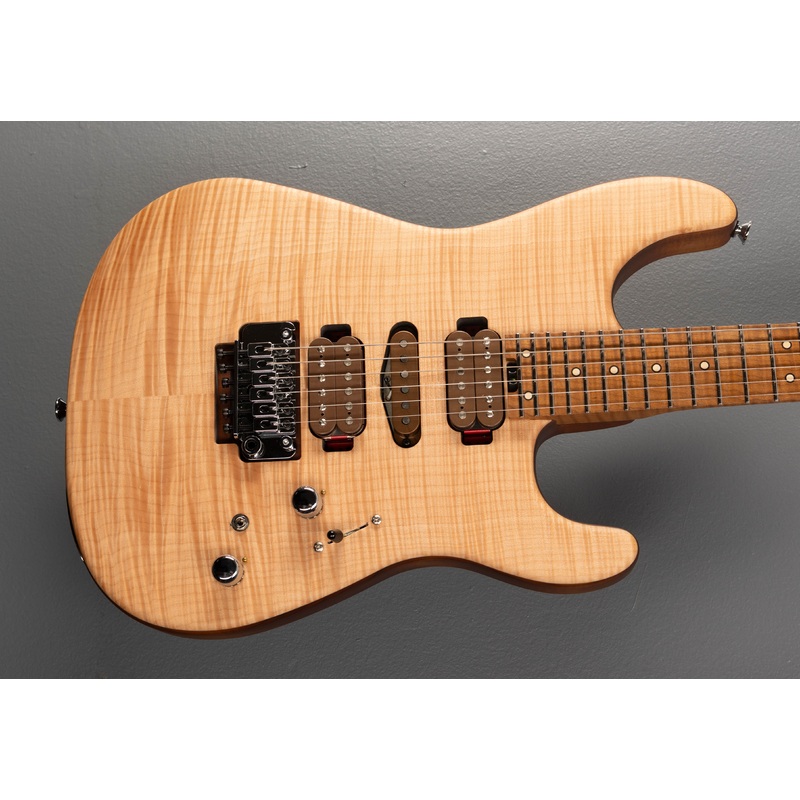 Satin Natural, Caramelized Basswood body with Flame Maple top, 12″-16″ compound radius Roasted Flame Maple fingerboard with Dot inlays and Jumbo Stainless Steel frets on a Speed shaped Caramelized Flame Maple neck with rolled edges and graphite reinforcement, 25.5″ scale length, 1.6875″ nut width, Charvel Custom MF Humbucking neck and bridge with Custom MF Single Coil pickups, Master Volume and Tone controls with 5 way switching and coil tap mini toggle, Recessed Charvel Locking Tremolo Bridge, Gotoh Locking tuners, 8.1 pounds, comes with hardshell case.
