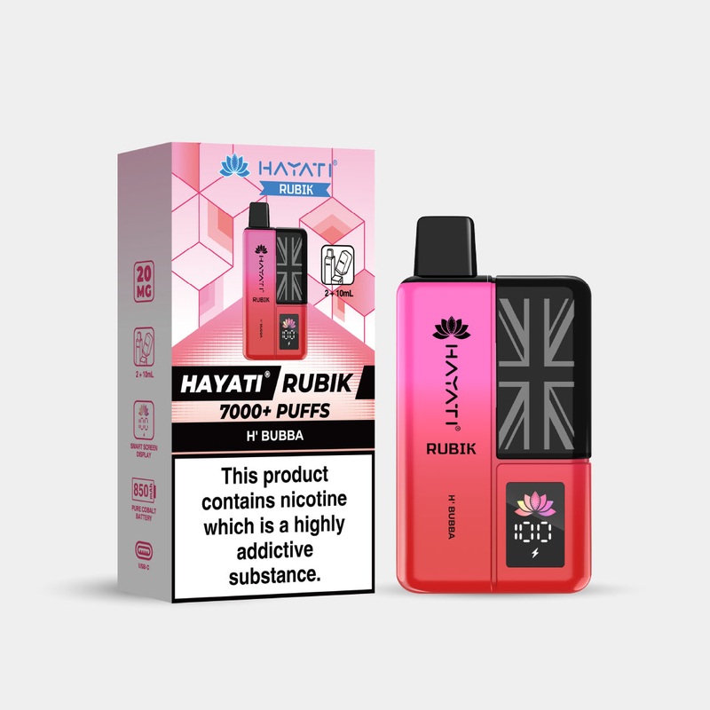 Hayati Rubik H' Bubba offers a Sweet and nostalgic, bursting with classic bubblegum flavour. Offering up to 7000+ puffs with smoother airflow and long-lasting flavour, it features an improved e-liquid delivery system with double cotton wicking for enhanced
