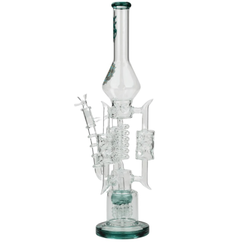 The H2OGlass Percolated Coil Recycler stands tall at 21". Coming with 6 rocket percs as well as 3 swiss percs, the smoke is going to get recycled throughout the bong as your rip is cooled to perfection. The coil in the middle also allows more travel distan