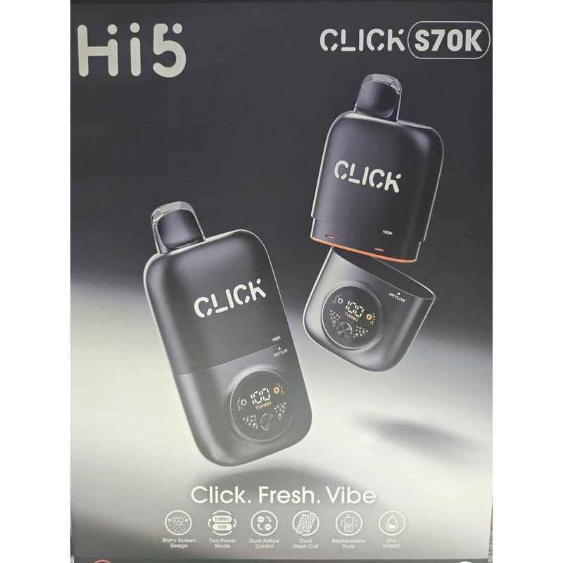 Hi5 Click S70K Starter Kit where innovation, style, and satisfaction come together in one sleek device. Designed for vapers who demand more from every puff, the Hi5 Click S70K redefines what a disposable-style vape can do.