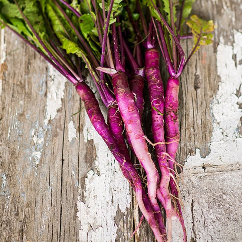Magenta colored roots of the Hinona Kabu Japanese Turnip are easily seen in the garden, protruding above the soil by a few inches, then turning white, stretching long and elegantly into the ground. Harvest the mild flavor roots at 1- 1 inches wide and 10-12 long and use raw, pickled or cooked. A traditionally Japanese turnip used to make sakura zuke cherry pickles.
