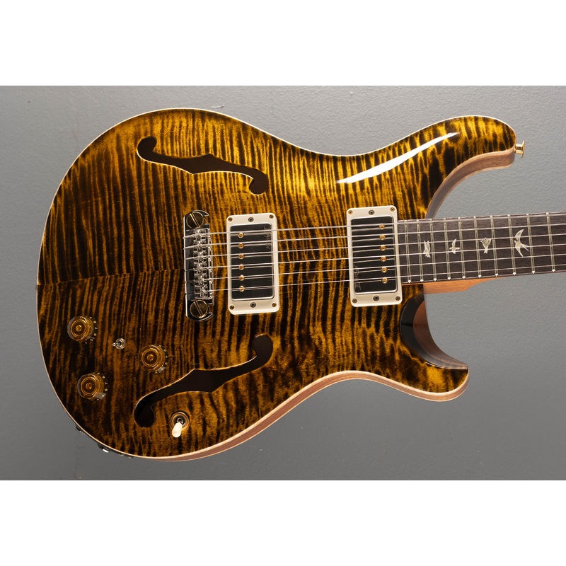 Yellow Tiger, High gloss nitro finish, Violin carved Flame Maple 10 top and back, Mahogany body core, Pattern carved Mahogany neck, 10″ radius Rosewood fingerboard with the Bird inlays, 25″ scale length, 1 11/16th” nut width, PRS 58/15 LT bridge and neck pickups with the L.R. Baggs/PRS adjustable piezo stoptail bridge, 3-way toggle switching with the volume and tone controls plus the piezo pickup system 3-way selector and blend knob, PRS Phase III non-locking tuners with the wing buttons, 5.6 pounds, With hardshell case