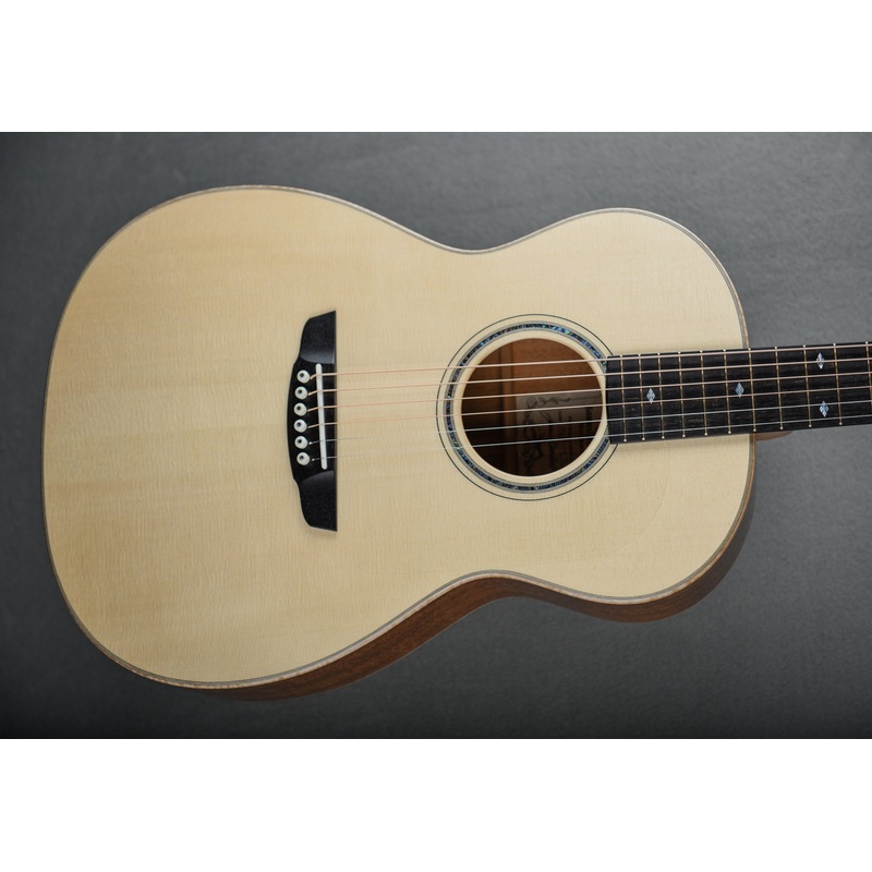 AAA Honduran Mahoganyback and sides, Master grade Adirondack spruce top, Ebony bridge, fretboard, fretboard binding, and headstock overlay, curly Maplebackstrip, body, and headstock binding. Mahogany neck, 25" scale, 14 frets to body, 1-3/4" nut width.Paua