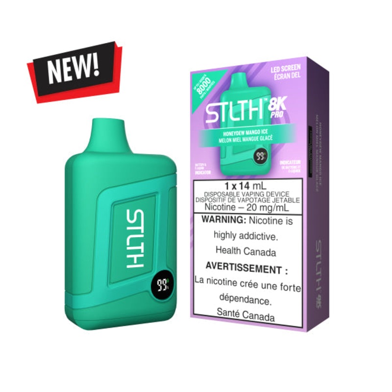 HONEYDEW MANGO ICE STLTH 8K PRO DISPOSABLEThe perfect blend of sweet honeydew and tropical mango, complemented by a refreshing icy touch. 1 Disposable Device 14mL of E-Liquid 800 mah Rechargeable Battery Up to 8000 Puffs Type-C Charger LED Screen MSRP Per