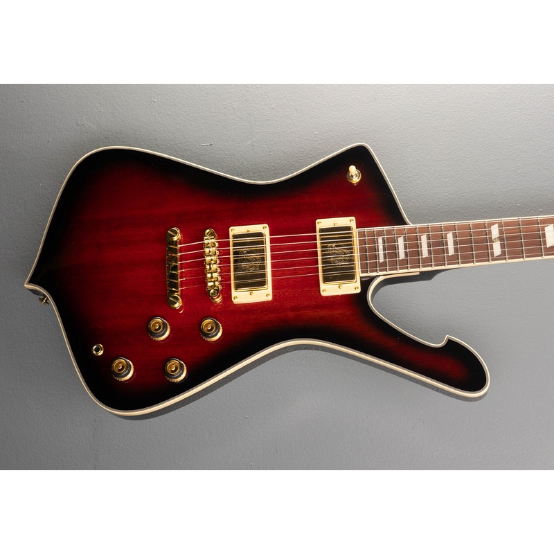Antique Autumn Burst, Okoume Body, Bound 12" radius Jatoba fingerboard with acrylic/abalone block inlays and medium frets on a IC shaped 3 piece Okoume neck, 24.75" scale length, 1 11/16" nut width, Ibanez Super 80 bridge and neck pickups, 3 way switching