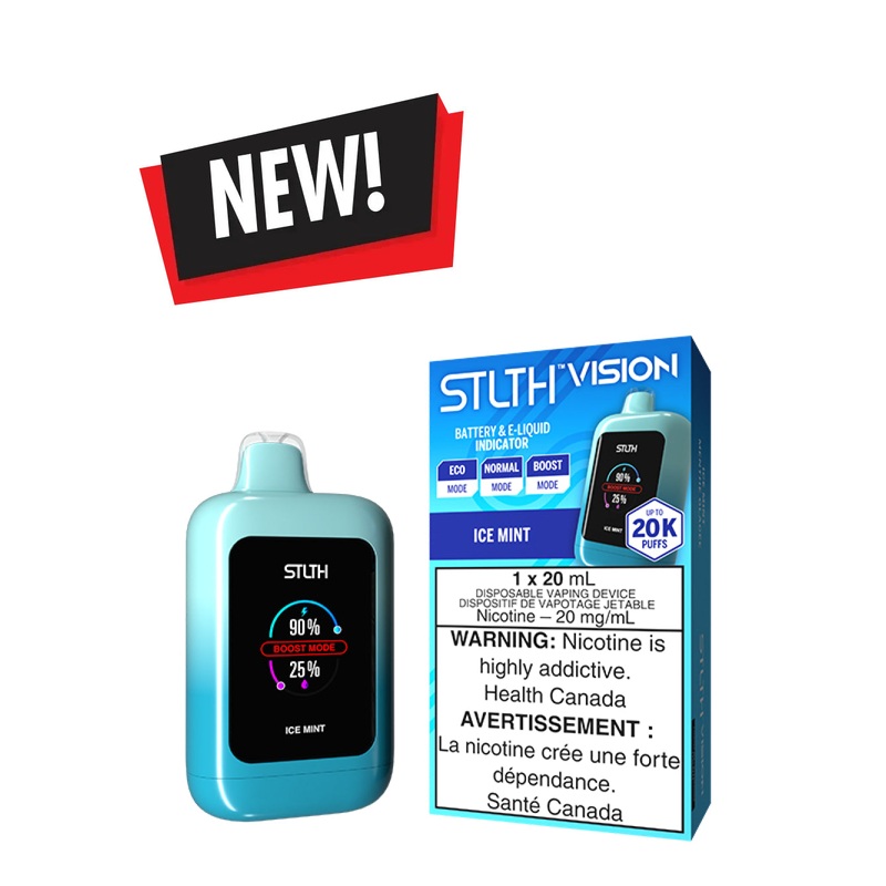 Ice Mint STLTH Vision Disposable A crisp, invigorating blast of pure minty freshness, as cool as a winter's breeze.______STLTH VISION 1 carton contains 1 Disposable Devices Dynamic Screen 3 Modes - ECO - NORMAL - BOOST 20mL of E-Liquid Airflow Control Rech