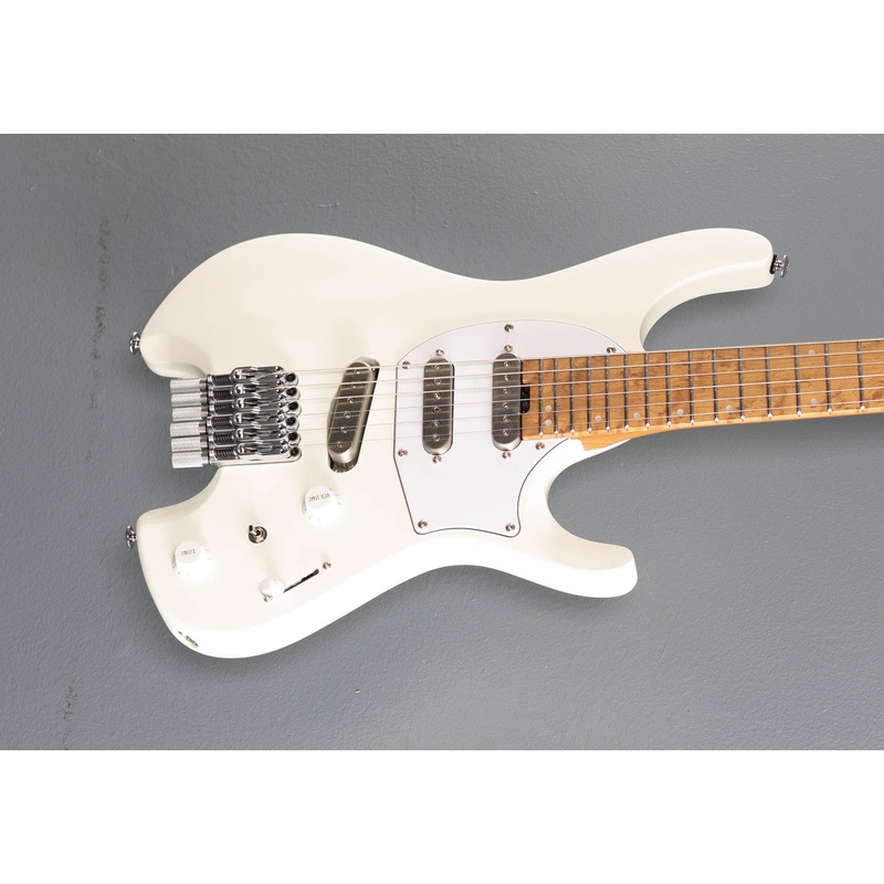 Vintage White Matte,Nyatoh body, Wizard C shaped three piece roasted Maple/Bubinga neck, 12" radius roasted Birdseye Maple fingerboard with the Mother of Pearl off-set dot inlays and jumbo Stainless Steel frets, 25.5" scale length, 1 5/8th" nut width, Iban