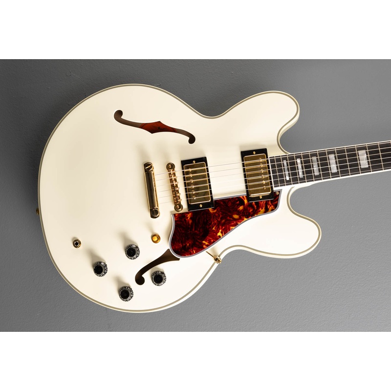 Classic White, VOS Finish, 5-ply Layered Maple/Poplar body with the Maple centerblock, Bound 12″ radius Ebony fingerboard with Mother of Pearl block inlays and Medium Jumbo frets on a 50s Rounded Medium C shaped One Piece Mahogany neck, 24.75″ scale length, 1.692″ nut width, Gibson Custombucker neck and bridge pickups, 3 way switching with volume and tone controls for each pickup, Tune-O-Matic bridge and Gibson Historic Reissue Aluminum Stop Bar tailpiece, Grover Rotomatic tuners, 8.6 pounds, comes with hardshell case.