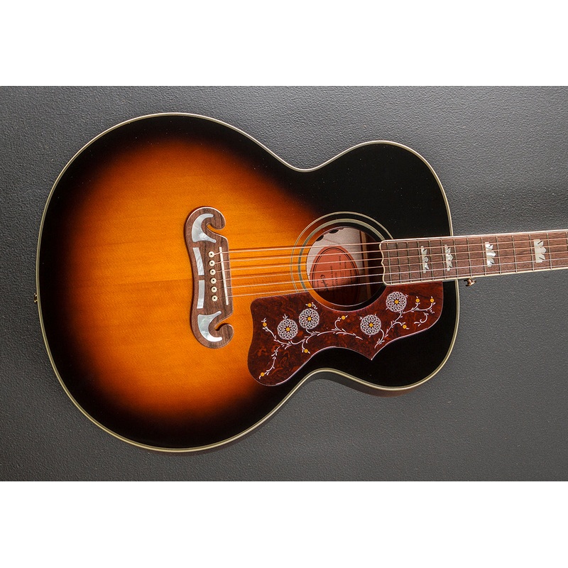 Vintage Sunburst, Super Jumbo body shape, Aged gloss finish, Solid Sitka Spruce top, Two Ring Rosette, Quartersawn Spruce bracing, Solid figured Maple back and sides, Multi-ply Ivory/Black top and back binding, 1960’s slim taper D shaped two-piece Maple neck with a Mahogany center strip, Bound 12″ radius Laurel fingerboard with the mother of pearl graduated crown inlays and medium jumbo frets, 25.5″ scale length, 1.692″ nut width, Epiphone deluxe tuners, Fishman Presys VT pickup system, Case not included