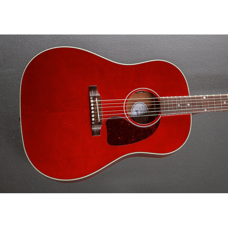 Cherry, Round Shoulder J-45 body shape, Gloss nitrocellulose lacquer finish, Sitka Spruce top, Traditional hand scalloped X bracing, Multi-ply top and single-ply back binding, Mahogany back and sides, Slim taper shaped Mahogany neck with a 12 radius Rosewood fingerboard and standard frets, 24.75 scale length, 1.72″ nut width, Grover tuners, With the L.R. Baggs VTC pickup system and hardshell case