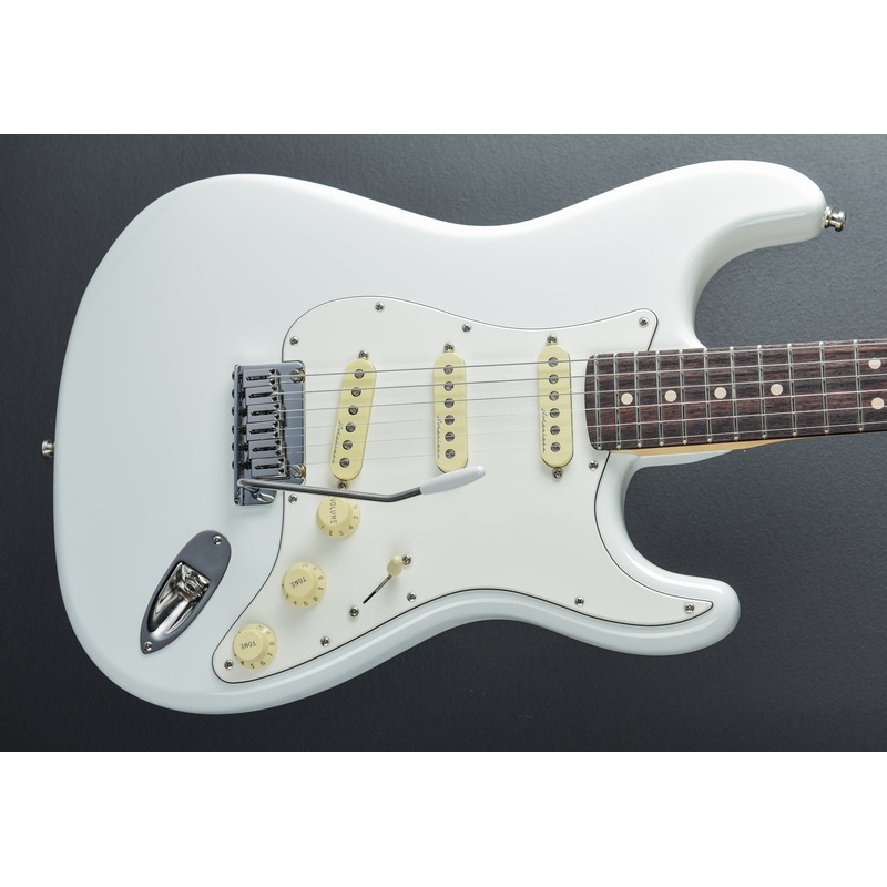 Olympic White, NOS urethane body finish, Alder body with the contoured heel, Beck C shaped Maple neck with a 9.5" radius Rosewood fingerboard and medium jumbo frets, 25.5" scale length, 1 11/16th" nut width, Fender Hot Noiseless single coil Strat pickups,