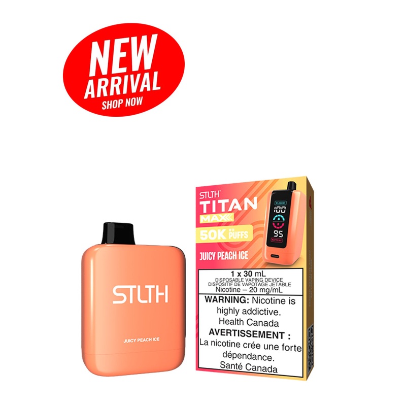 JUICY PEACH ICE STLTH TITAN MAX DISPOSABLESucculent, ripe peaches bursting with natural sweetness, paired with a crisp icy finish that delivers a smooth and cooling refreshment.______STLTH TITAN MAX - WITH MEGA SCREEN 1 box contains 1 Disposable Device 30m