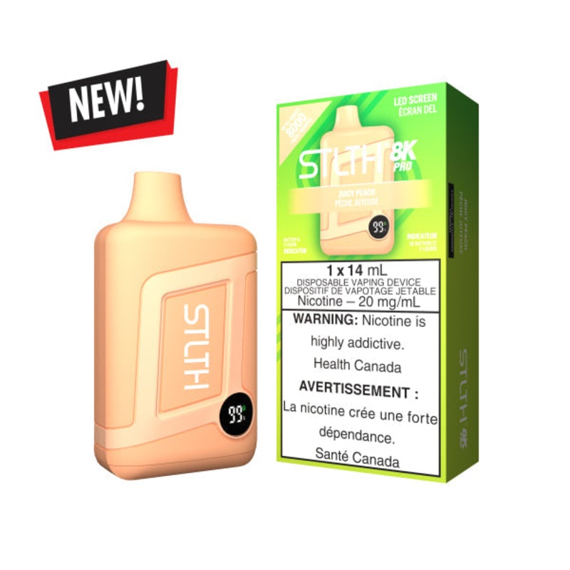 JUICY PEACH (NO ICE) STLTH 8K PRO DISPOSABLEThe pure essence of juicy peach is captured in every delightful puff. 1 Disposable Device 14mL of E-Liquid 800 mah Rechargeable Battery Up to 8000 Puffs Type-C Charger LED Screen MSRP Per Unit: 30.72$ (24.00$ + 6