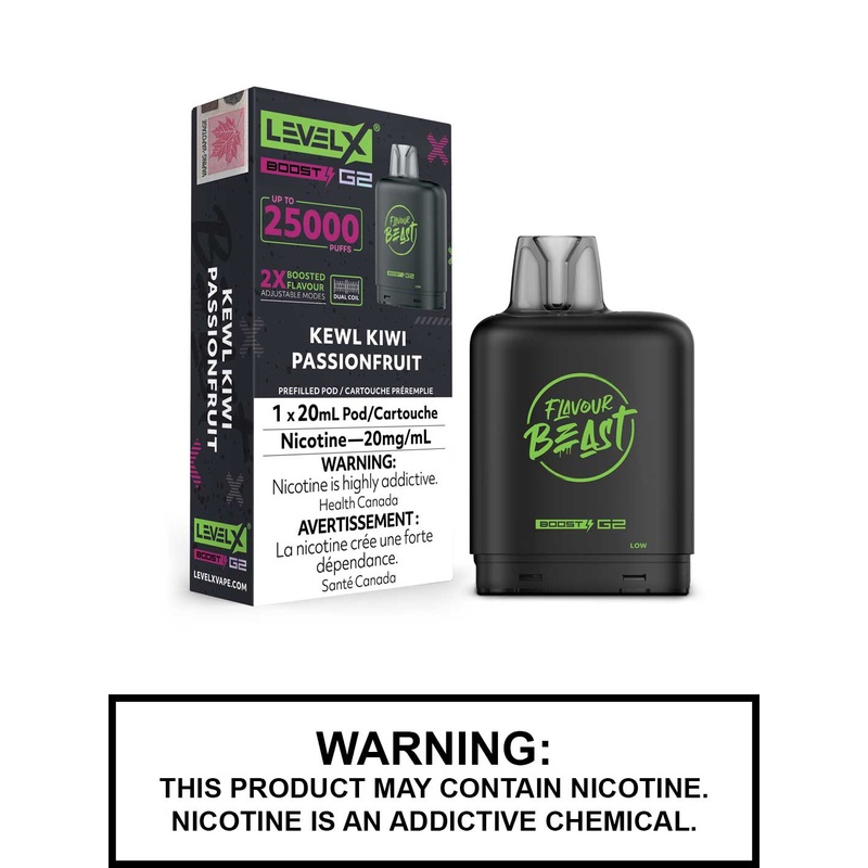 Introducing the Kewl Kiwi Passionfruit Flavour Beast Level X Boost G2 Pods, the latest innovation in the Level X vape family. These pods feature an impressive 20mL capacity, delivering up to 25,000 puffs and setting a new benchmark for Level X pods. Compatible with the Level X Boost battery and the new Level X Boost G2 battery, the Level X Boost G2 pods offer three distinct firing modes: Eco Mode for up to 25,000 puffs of smooth, subtle flavour; Standard Mode for up to 15,000 puffs of rich, flavourful hits; and Boost Mode for up to 10,000 puffs of intense flavour and cloud production.