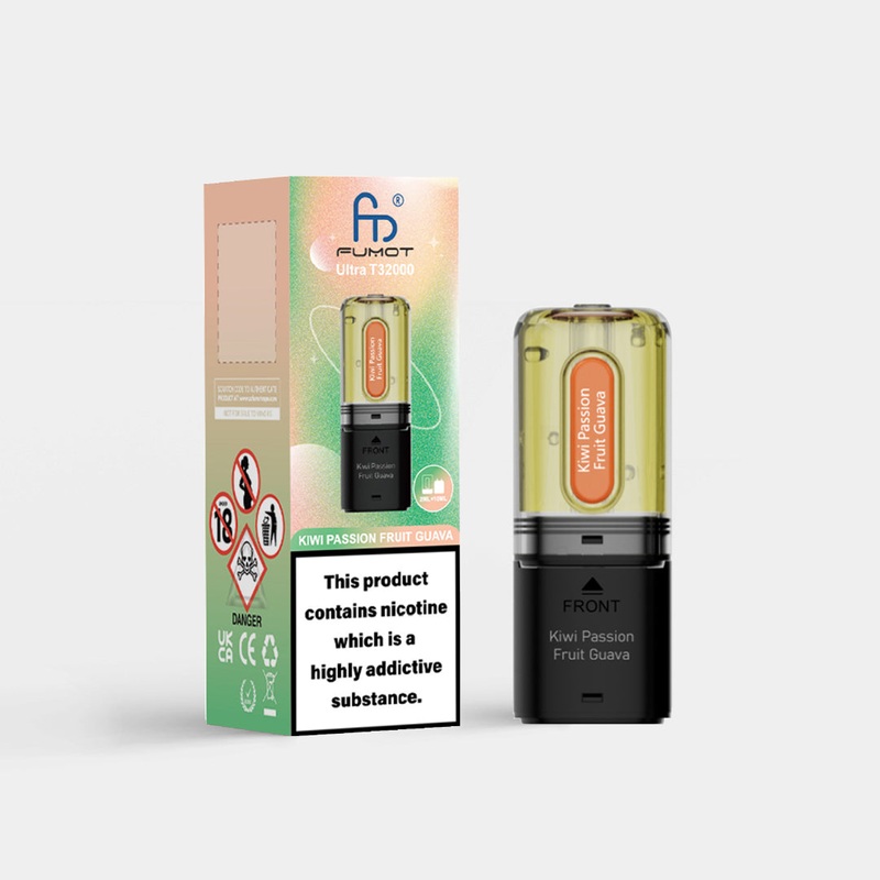 Fumot Ultra T32000 Pods Kiwi Passionfruit Guava Enjoy up to 16,000 puffs of vibrant flavour. Each pod includes 2ml + 10ml of e-liquid, blending tropical kiwi, tangy passionfruit, and smooth guava in every puff.