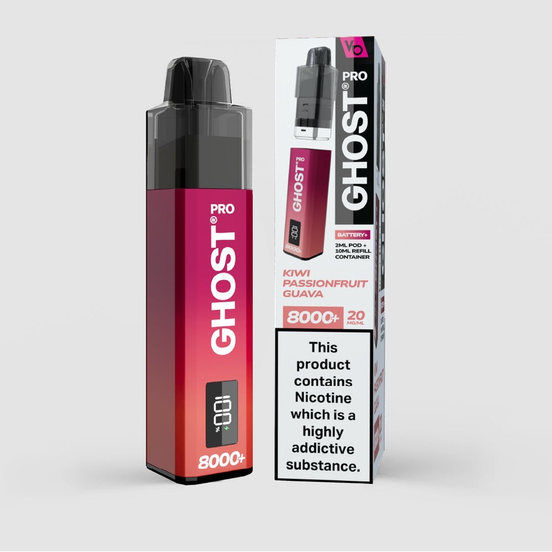 SOLD ONLY IN THE UK. Ghost Pro 8000+ Kiwi Passionfruit Guava combines tart kiwi, sweet passionfruit, and exotic guava. Fruity, vibrant, and refreshingly tropical. Upgraded version of the popular Ghost Pro 6000+, now with Removable pods extended vaping up t