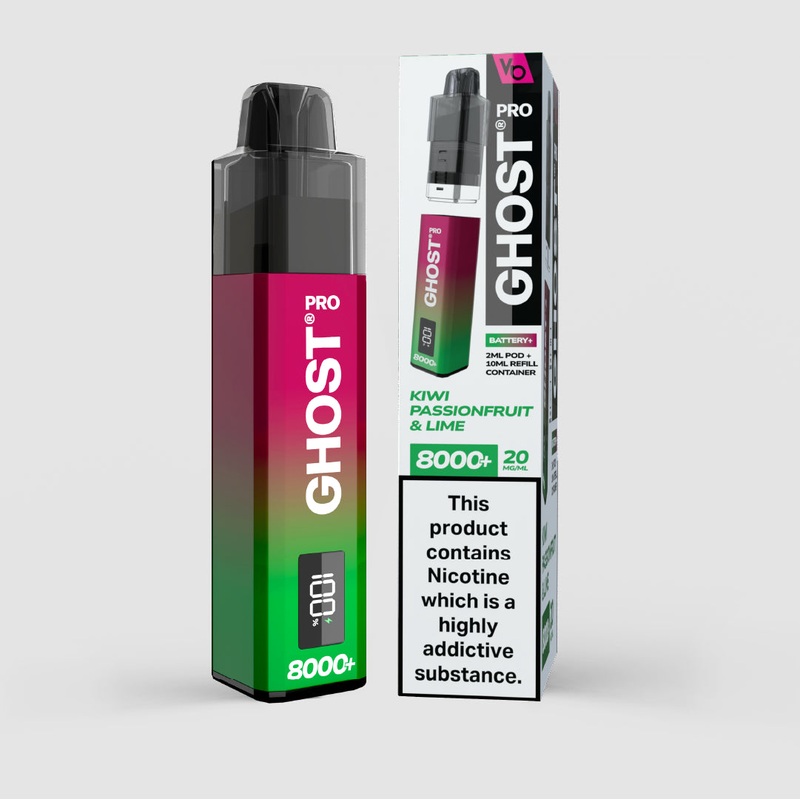 SOLD ONLY IN THE UK. Ghost Pro 8000+ Tangy kiwi, sweet passionfruit, and a zesty lime kick. Bold, fruity, and refreshingly tart. Upgraded version of the popular Ghost Pro 6000+, now with Removable pods extended vaping up to 8000 puffs.