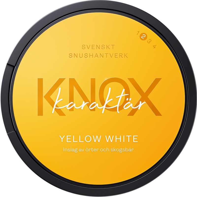 Knox Karaktr Yellow White is a large-format white portion snus featuring a rich blend of herbs, forest berries, and distinct tobacco character. Each portion delivers 11 mg of nicotine, offering a medium-strength experience. The white portion design ensures a longer-lasting flavour with less drip, providing a smooth and satisfying snus experience. Perfect for those seeking a herbal and berry twist with a traditional tobacco presence. Available exclusively at Snuskompagniet.