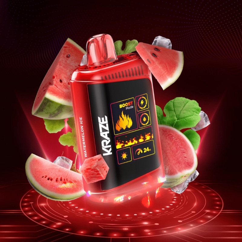 Kraze HD Mega 20k Watermelon Ice disposable vape Let your tastebuds soak up the summer time with this amazing, Juicy, Sweet, Ripe Watermelon flavor! finished off with the perfect amount of ice, This is a super refreshing disposable. With up to 20,000 Puffs, Dual mesh coils and a very detailed 1.77″ screen these are an absolute unit of a disposable!