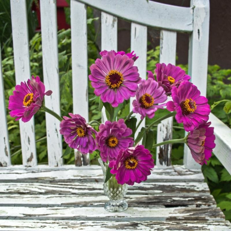 Lavender zinnia. Classic flowers on 3-foot tall plants can now be ordered by color. We trialed them and loved them all. Each color has a profusion of blooms and looks stunning in a mass planting. It will last for a surprisingly long time as a cut flower.