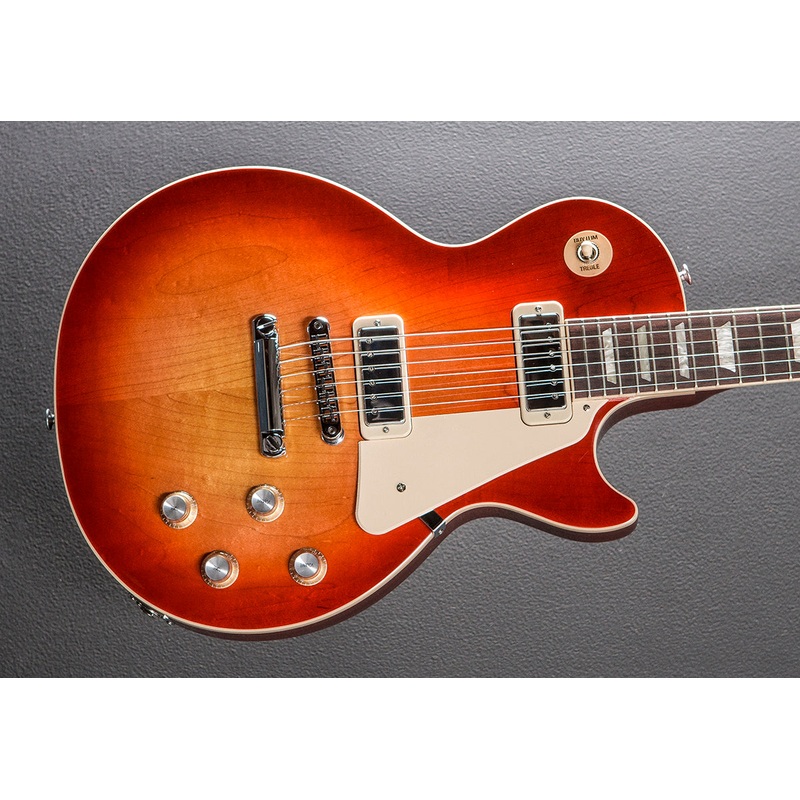 70’s Cherry Sunburst, Gloss nitrocellulose lacquer finish, Maple top on a solid Mahogany body, Rounded C shaped Mahogany neck, Bound 12 radius Indian Rosewood fingerboard with the acrylic trapezoid inlays and medium jumbo frets, 24.75 scale length, 1.7 nut width, Mini humbucking bridge and neck pickups, 3-way toggle switching with the volume and tone controls for each pickup, Tune-o-matic bridge and aluminum stopbar tailpiece, Gibson deluxe tuners, 8.8 pounds, With hardshell case