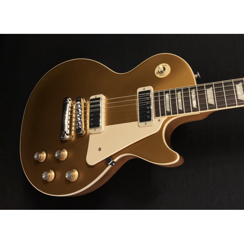 Gold Top, Gloss nitrocellulose lacquer finish, Maple top on a solid Mahogany body, Rounded C shaped Mahogany neck, Bound 12 radius Indian Rosewood fingerboard with the acrylic trapezoid inlays and medium jumbo frets, 24.75 scale length, 1.7 nut width, Mini humbucking bridge and neck pickups, 3-way toggle switching with the volume and tone controls for each pickup, Tune-o-matic bridge and aluminum stopbar tailpiece, Gibson deluxe tuners, 9.2 pounds, With hardshell case