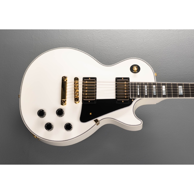 “As the flagship model from Gibson Custom Shop, the Les Paul Custom lives up to the high standards set by its 1950s archetype while evolving to a level of tone and performance more suited to today’s musical demands. Beneath the layers of its “tuxedo” appointments lies the crisp, edgy voice of a matched 490/498 humbucker set, a solid Ebony fingerboard, a long neck tenon for maximum sustain and a two-piece maple top over a solid mahogany body which adds the perfect amount of sonic bite to everything from jazz to hard rock. It sounds as good as it looks, and it looks as good as it sounds!”