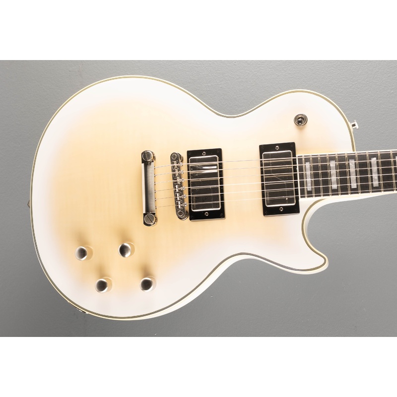 Aged White Tiger Burst, Mahogany body with carved Hard Maple cap with AAA Flame Maple veneer body, Bound 12.01″ radius Ebony fingerboard with Block and Triangle inlays and Jumbo frets on an Asymmetrical Slim Taper shaped Mahogany neck, 24.72″ scale length, 1.69″ wide Graph Tech NuBone XL Black nut, Fishman Fluence Epiphone Prophecy bridge and neck pickups, 2 Volume controls w/ push/pull coil splits, 2 Tone controls w/ push/pull Vintage/Modern voice switching, Epiphone LockTone Tune-O-Matic, Grover Locking Rotomatic tuners, 8.3 pounds, comes with gig bag.
