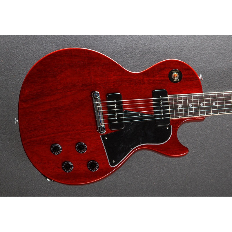 Vintage Cherry, Gloss nitrocellulose lacquer finish, Mahogany body, Vintage 50s shaped Mahogany neck,Bound 12 radius Rosewood fingerboard with the acrylic dot inlays and medium jumbo frets, 24.75 scale length, 1.69″ nut width, P-90 bridge and neck pickups, 3-way toggle switching with the volume and tone controls for each pickup, Wraparound tailpiece, Gibson vintage deluxe tuners, 8.6 pounds, With hardshell case