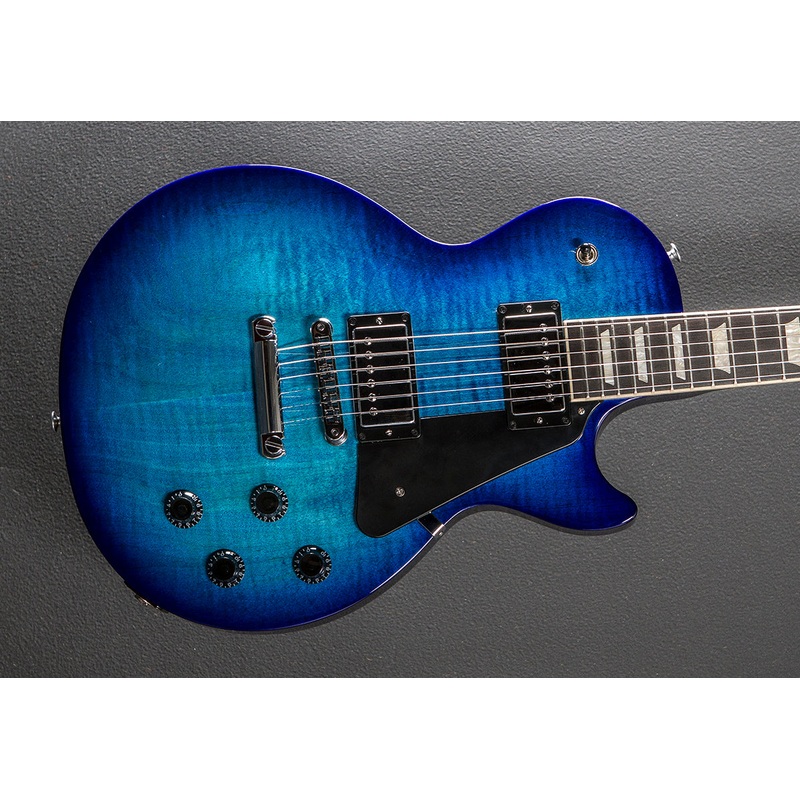 Cobalt Burst, Gloss nitrocellulose lacquer finish, Carved AA figured Maple top, Mahogany body with the ultra-modern weight relief, Modern contoured heel neck joint, Slim taper shaped Mahogany neck, Bound 12″ radius Ebony fingerboard the acrylic trapezoid inlays and medium jumbo frets, 24.75 scale length, 1.69″ nut width, ’57 Classic Plus bridge and ’57 Classic neck pickups, 3-way toggle switching with the push/pull coil tap volume and push/pull phase/pure bypass tone controls for each pickup, Aluminum Nashville tune-o-matic bridge and stop tailpiece, Grover Rotomatic tuners, 7.8 pounds, With the Gibson softshell case