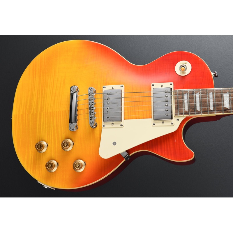 Heritage Cherry Fade, Aged gloss finish, Carved Hard Maple cap with AAA figured Maple veneer, Mahogany body, Glued in/long tenon neck joint, '59 rounded C shaped Mahogany neck, Bound 12 radius Indian Laurel fingerboard with the trapezoid inlays and medium