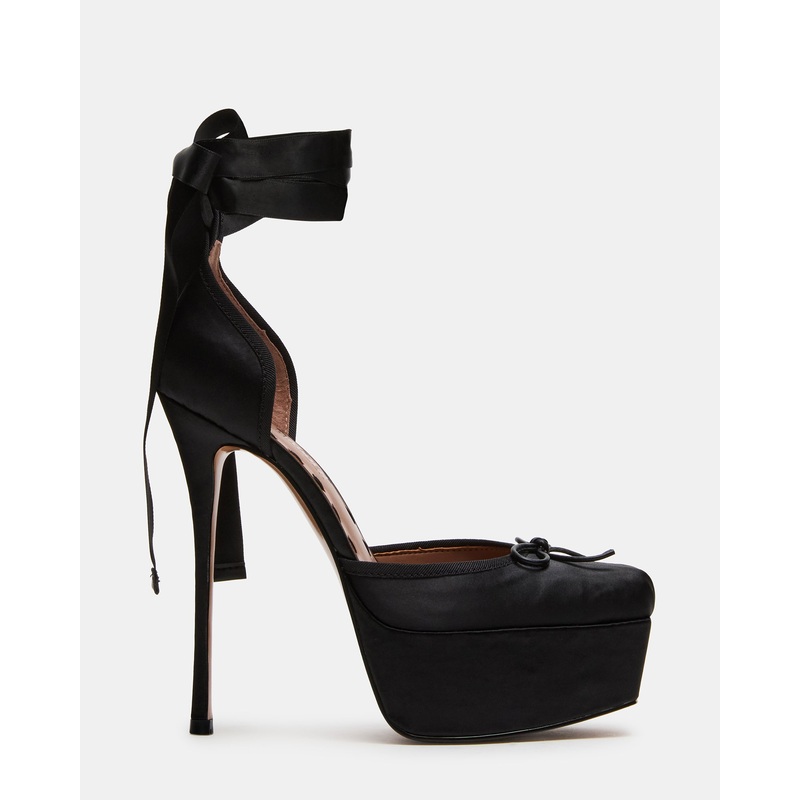 Elevate your style with the LISTEN BLACK SATIN heels, featuring a platform sole and delicate strappy lace-up design inspired by classic ballet shoes. Crafted to provide both elegance and stability, these heels enhance your silhouette while ensuring confide