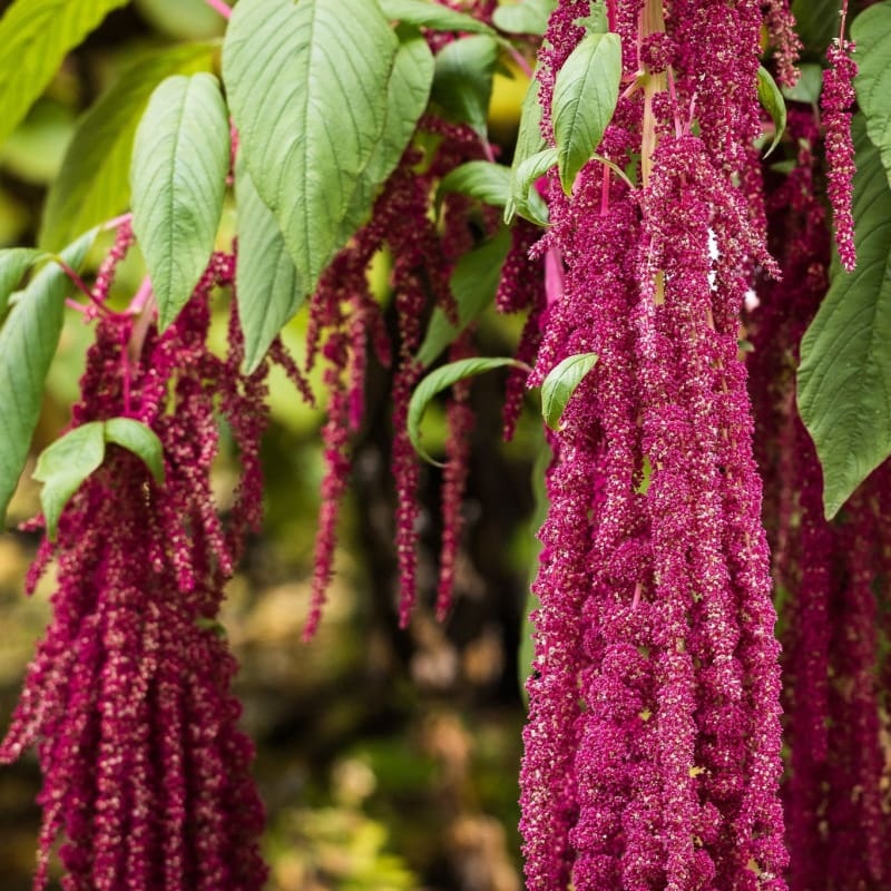 Love Lies Bleeding Amaranth is lovedfor its color and its one of a kind flower clusters. Leaves are reddishly forming abushy type plant that produces long, drooping tasselsof purple-redflowers. Will grow to a height of 3feet andspreadsto an equal width.