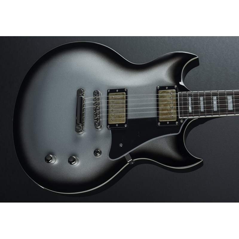 “Joining the Bill Kelliher Signature Series, the LTD Royal Shiva is based on a guitar that the Mastodon guitar king had created by the ESP Custom Shop and used it extensively on recent tours. Its a completely unique double-cutaway body shape with an outstanding Silver Sunburst finish that extends to the back of the guitars body and neck, with white binding on the body, neck, and headstock. The Royal Shiva uses traditional set neck construction at 25 scale, joining a maple-capped mahogany body with a three-piece u-shaped mahogany neck, per Bills personal specifications. Its Macassar ebony fingerboard has large mother-of-pearl block inlays and 22 extra-jumbo frets. Pro-tier nickel-finished hardware on the Royal Shiva includes a TonePros TOM bridge and tailpiece, LTD locking tuners, a bone nut, a multi-ply black pickguard, and a set of Bills signature Mojotone Hellbender humbucker pickups. Designed for both brutality and beauty, these nickel-covered pickups offer everything from raw and menacing tones to complex, articulate, and open cleans. Both the bridge and neck pickups may be split individually with push-pull controls on the volume and tone knobs. Includes deluxe ESP hardshell case.”
