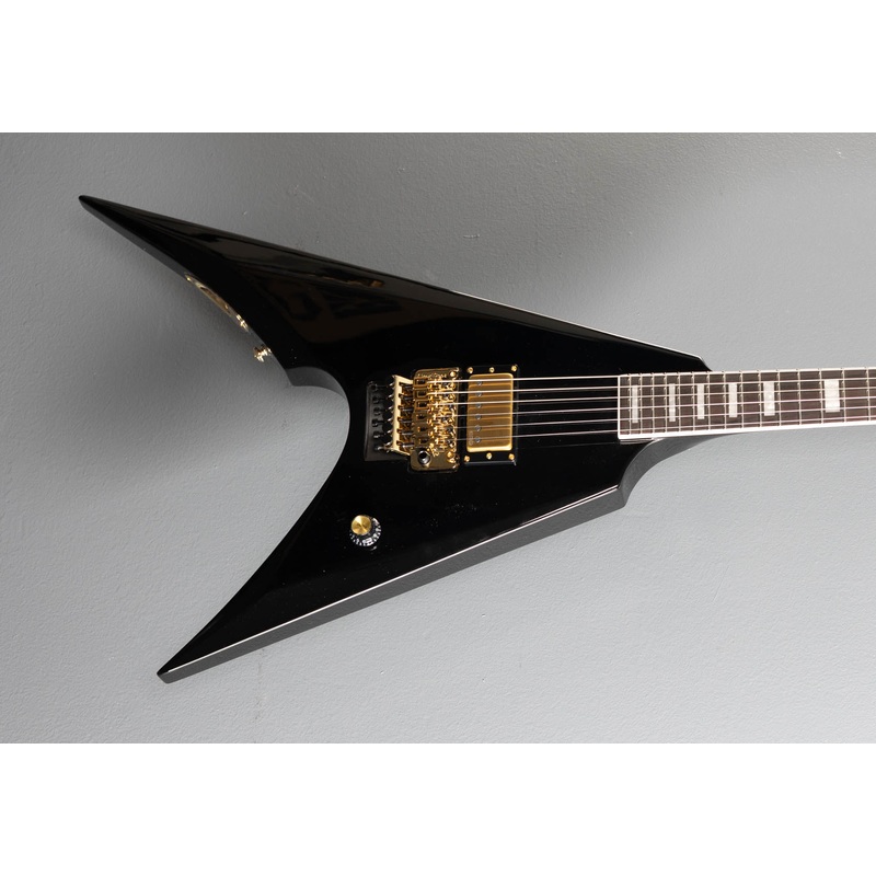 Black Gloss, Mahogany body with a Maple cap, bound 13.78 radius Macassar ebony fingerboard with block inlays and extra jumbo stainless steel frets on a 3 piece thin U shaped thru body mahogany neck, 24.75 scale length, 42mm nut width, EMG JH (James Hetfield) bridge pickup with master volume control, Floyd Rose 1000 tremolo bridge, Grover tuners, 6.6 pounds, comes with hardshell case.