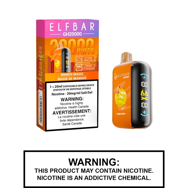 Introducing the Mango Magic Elf Bar GH20000 disposable vape, the latest addition to the renowned Elf Bar family. Featuring 20mL of vape juice and an 850mAh rechargeable battery, the Elf Bar 20K sets a new standard in disposable vaping. This new Elf Bar vape boasts an enhanced triple mesh coil system, offering three distinct power modes to suit your preferences.
