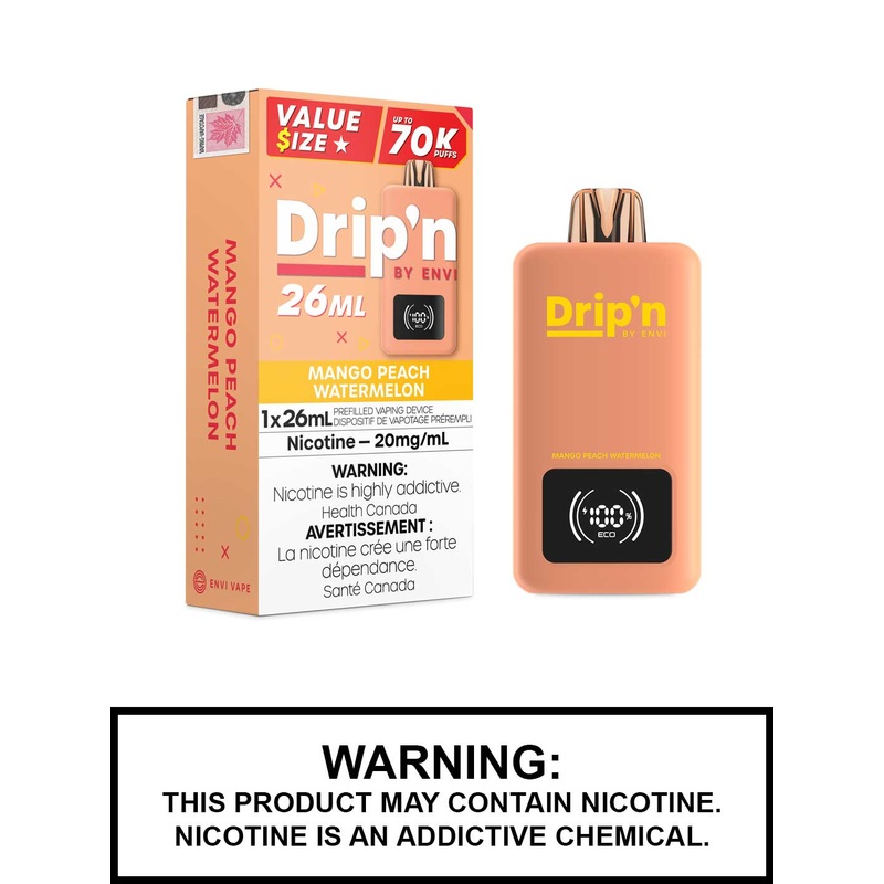 Get more out of every puff with the Mango Peach Watermelon Dripn 26mL disposable vape – a high-capacity, flavour-forward device from Dripn by Envi built for serious performance. Featuring a large 26mL vape juice capacity and up to 70,000 puffs in Eco Mode, this Dripn vape is engineered for longevity without sacrificing flavour.